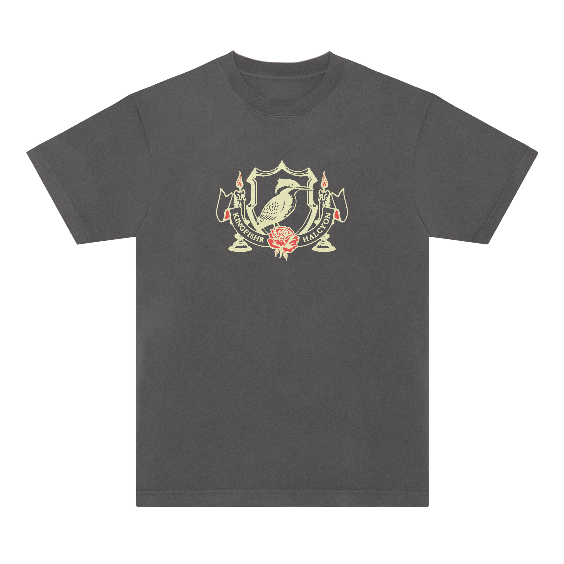 Unisex dark grey t-shirt featuring a vintage style emblem crest.